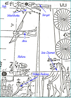 O circulo celeste, representado pelo Zodíaco, é suportado por doze deuses, quatro femininos e oito de joelhos (Figura 4,3). Os deuses com cabeça de falcão simbolizam a eternidade, dando assim um princípio intemporal a cena celeste. As deusas dão o quadro espacial, cada uma indica um ponto cardinal perfeitamente orientado. Ao lado de cada deusa está escrita em hieróglifo o seguinte ritual: